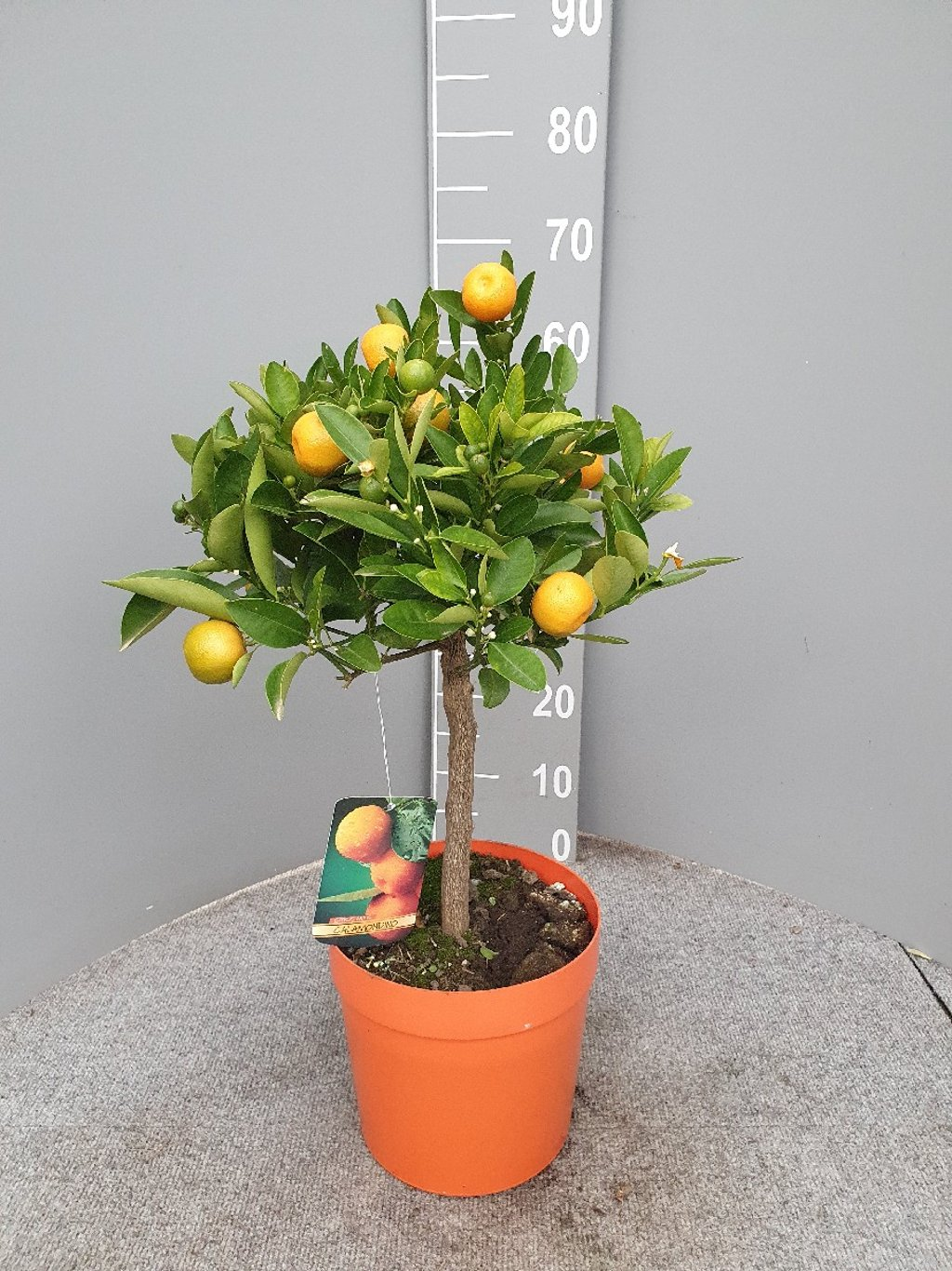 Citrus microcarpa ‘Mitis’, ook wel calamondin genoemd, is een compacte citrusplant met glanzend donkergroen blad, geurende witte bloesem en kleine oranje vruchten. De vruchten lijken op mini-sinaasappels en blijven vaak lang aan de plant hangen, waardoor hij het hele jaar decoratief is. Ideaal als kuipplant voor terras, balkon of serre.